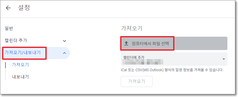 좀 전에 압축풀었던 파일에서 이전 계정 또는 가져올 캘린더의 파일을 선택하여 가져옵니다.